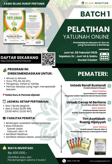 Berangkat dari kebutuhan tersebut, Ruang Hijaiyyah menyelenggarakan Pelatihan Guru Metode Yatlunah, sebuah program pembinaan bacaan Al-Qur’an yang dirancang terstruktur, bertahap, dan berbasis praktik, agar guru tidak hanya mampu membaca dengan benar, tetapi juga mampu mengajarkan bacaan yang benar kepada santri sejak huruf pertamanya.